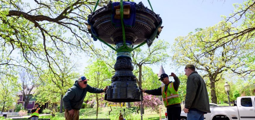 After a restoration over the winter, the cast iron fountain at Irvine Park in St. Paul was returned to its base on Thursday with the help of Cora Metal Works and Rocket Crane.