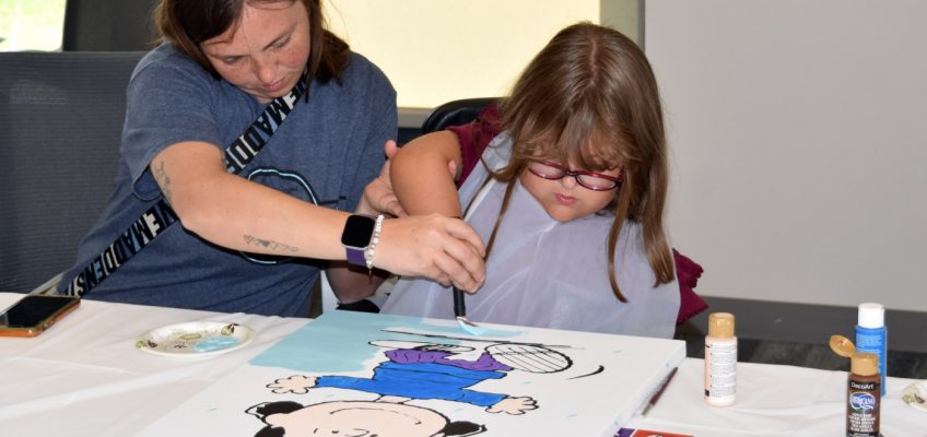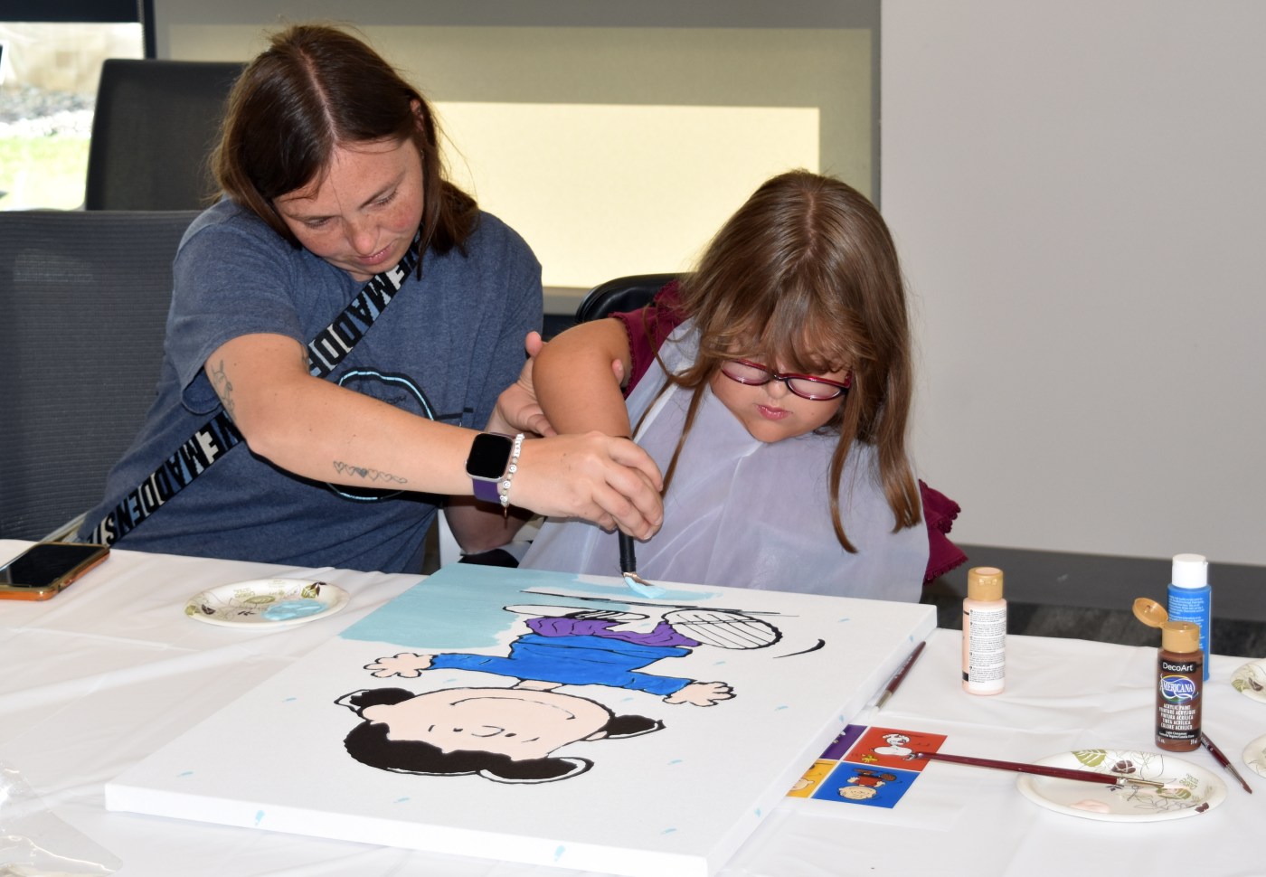 The six-panel canvas piece featuring “Peanuts” characters like Charlie Brown, Snoopy, Linus and crew, was donated by the Foundation for Hospital Art, a national nonprofit that donates “joyful Peanuts-themed murals to hospitals around the world.” Many children participating in the event have orthopedic conditions that can affect hands and arms and make joint movement challenging, but it doesn’t stop them from getting in on the fun.