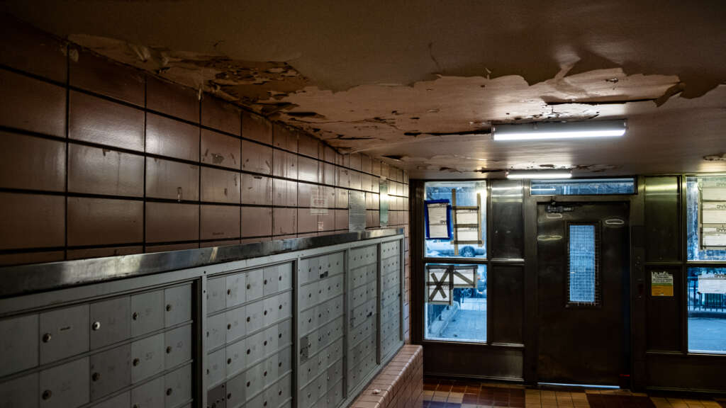 Peeling paint at in the lobby of a senior building at NYCHA’s Mitchel Houses in the Bronx. (Adi Talwar/City Limits)