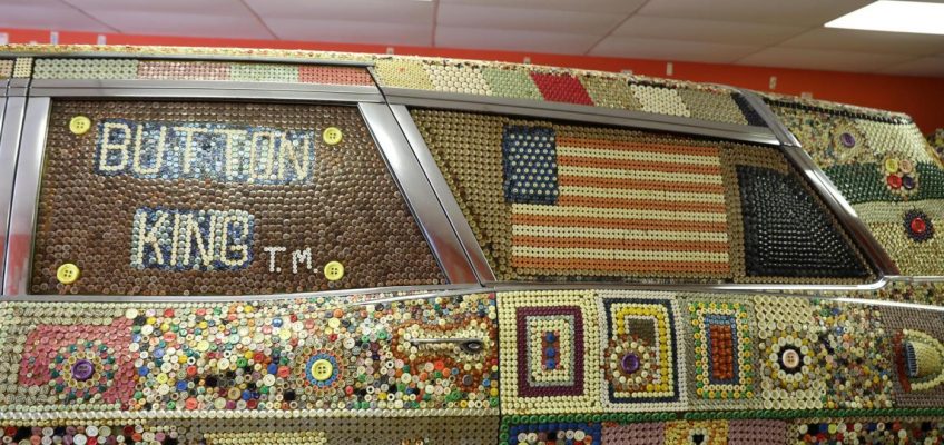 They are sewn onto the original button suit on the mannequin that started it all. Nearby is the Chevrolet Chevette covered in buttons of all colors, big and small. There’s a walk-in outhouse with a toilet covered in buttons and a piano with buttons everywhere but the keys. There’s a button-covered hearse not too far from the coffin where white buttons stand out from all the rest, spelling out “BUTTON KING.”