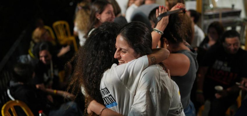 A Champagne bottle was popped open to cheers from the crowd. Sweets were doled out. Tears of joy mixed with laughter and long embraces as the news sunk in: The struggle to free Israeli captives held in Gaza appears to finally be coming to a close.
