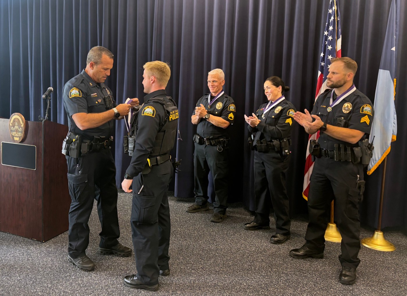 Langr was a recipient after he and another officer were on patrol in 2021, heard gunshots and found a victim with life-threatening injuries. Rooney received it for providing aid to a woman after a serious domestic assault in the early 2010s.