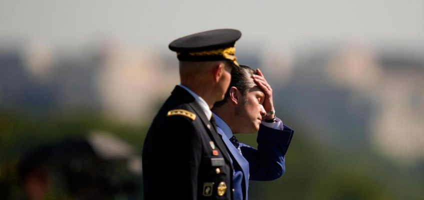 Defense Secretary Pete Hegseth reviews troops during the POW/MIA National Recognition Day Ceremony at the Pentagon, Friday, Sept. 19, 2025, in Washington. (AP Photo/Julia Demaree Nikhinson)