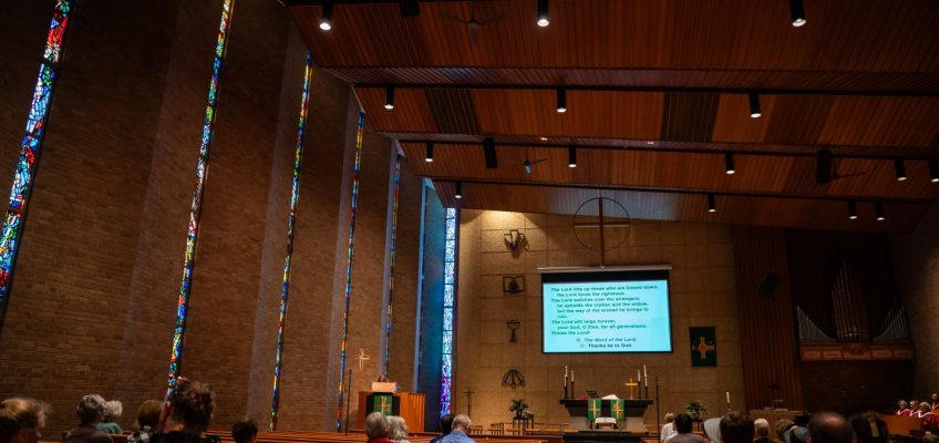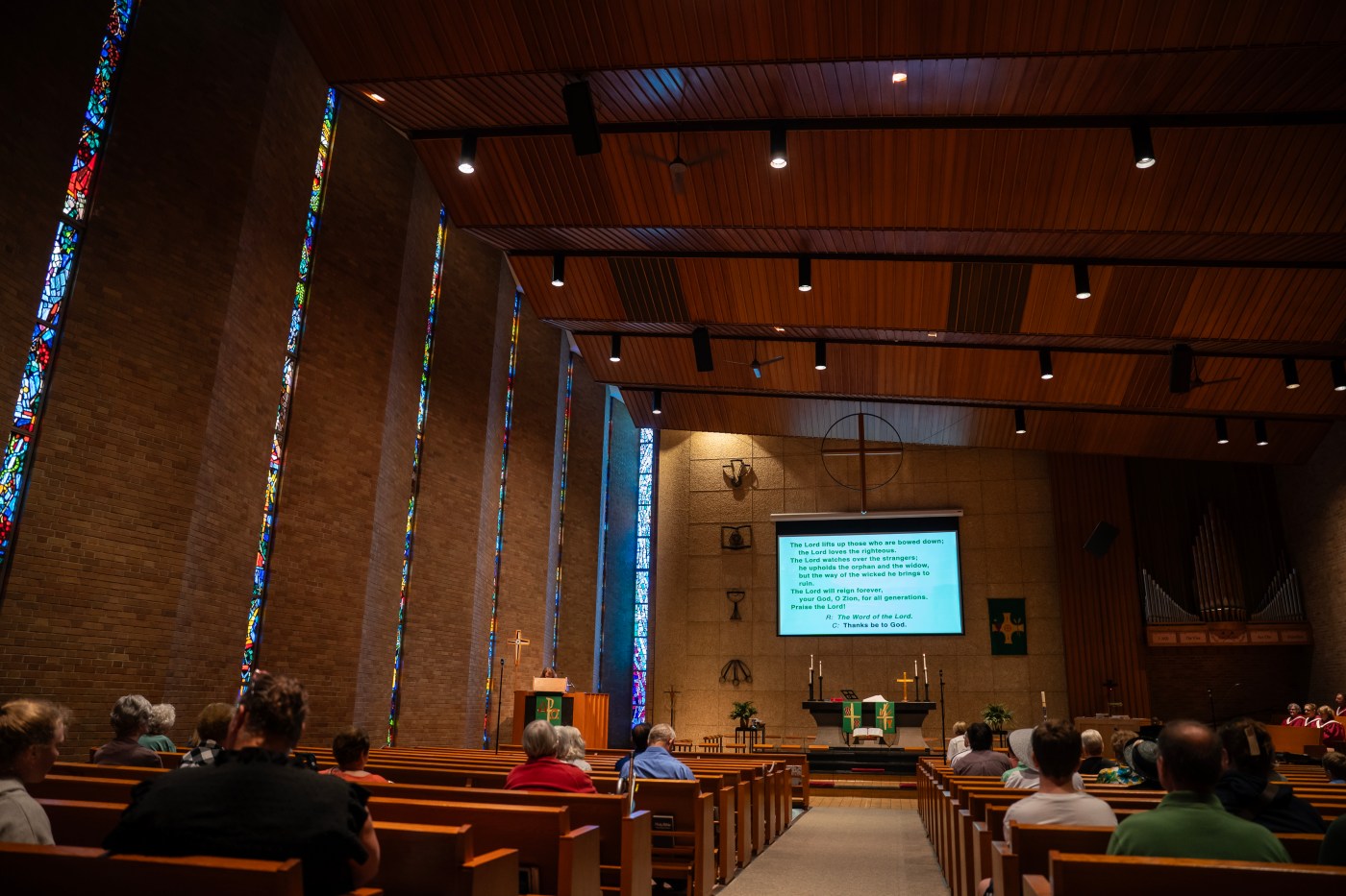 People gather for services at Luther Memorial Church in South St. Paul on Sunday, Sept. 28, 2025. (Claudia Staut / Pioneer Press)