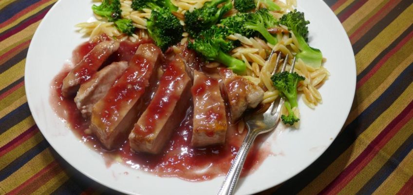 I came across bottled sangria at the market and was inspired by its fruity, spiced notes—perfect for pairing with tender pork loin chops. The sangria adds a subtle depth of flavor that complements the savory richness of the meat. To round out this early fall dinner, orzo, a rice-shaped past, is simmered with broccoli florets, making a quick, colorful side dish.