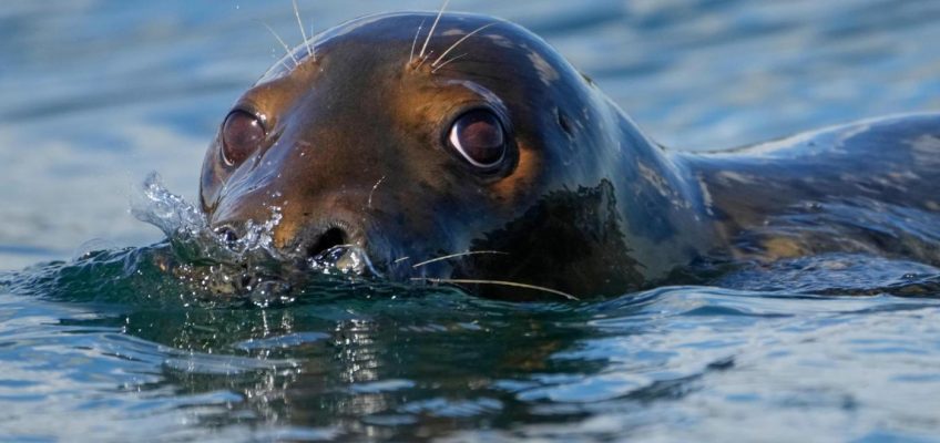 A harbor seal rests on a submerged ledge near fishermen harvesting herring, Monday, Oct. 6, 2025, off Portland, Maine. (AP Photo/Robert F. Bukaty)