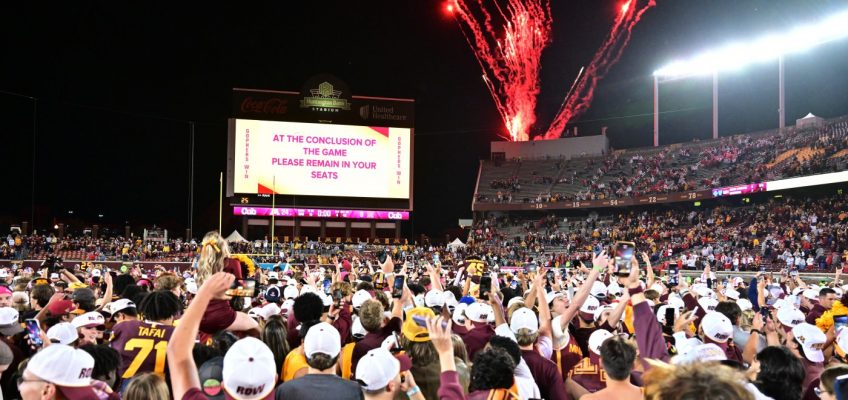 Last year, Gophers fans stormed the field in early October after a dramatic 24-17 home win over No. 11 Southern Cal in early October. Safety Koi Perich made a game-changing interception and fans hoisted the true freshman above the sea of happy fans.
