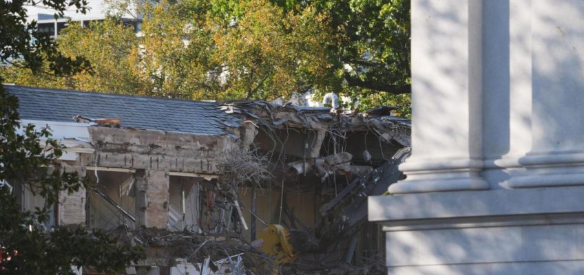 Dramatic photos of the demolition work showed a backhoe tearing into the East Wing façade and windows and other building parts in tatters on the ground. Some reporters watched from a park near the Treasury Department, which is next door to the East Wing.