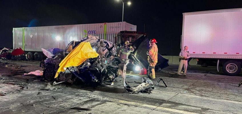 Dashcam video from the tractor-trailer obtained by KABC-TV shows the truck slamming into what appears to be a small, white SUV in the freeway’s center lane. It continued forward, plowing into several other vehicles, including another truck. It then crossed over two lanes before crashing into an already-disabled truck on the freeway’s right shoulder.