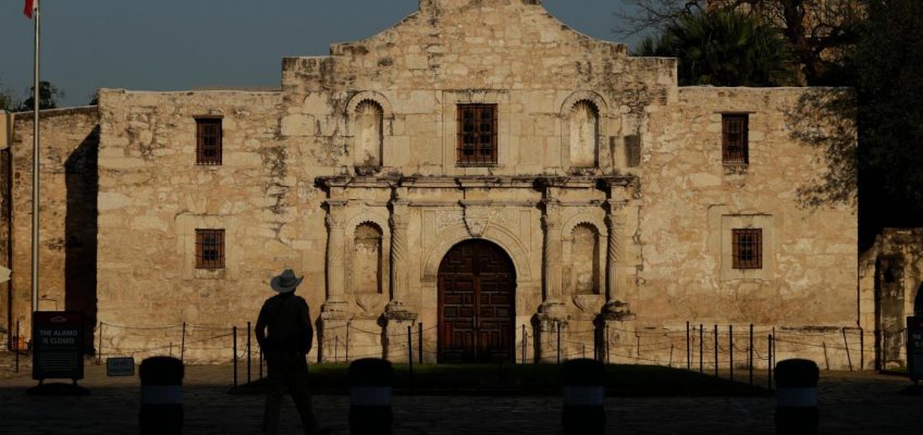 FILE – The Texas flag waves in front of the Alamo during a reenactment of the delivery of William B. Travis’ “Victory or Death” letter, Wednesday, Feb. 24, 2016, in San Antonio. (AP Photo/Eric Gay, File)