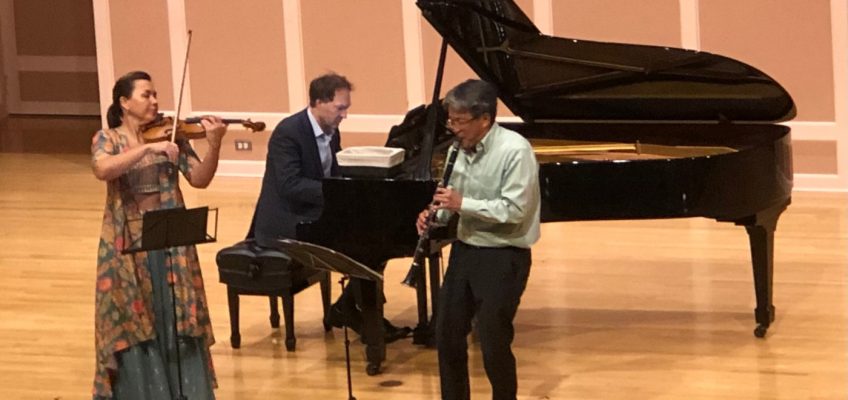 After intermission came two trios that showcased Hara’s remarkable artistry. First, in Charles Ives’ Largo for violin, clarinet and piano, he played with a clear, warm, and impeccably controlled tone. Then, in Wolfgang Amadeus Mozart’s Trio “Kegelstatt” in E-Flat Major, his agility complemented the unusual instrumental pairing, alongside Lovelace’s elegant pianism and Chisholm’s assured musicality.