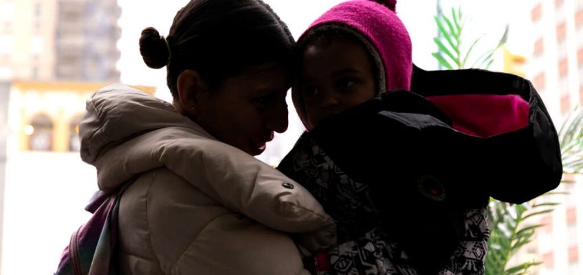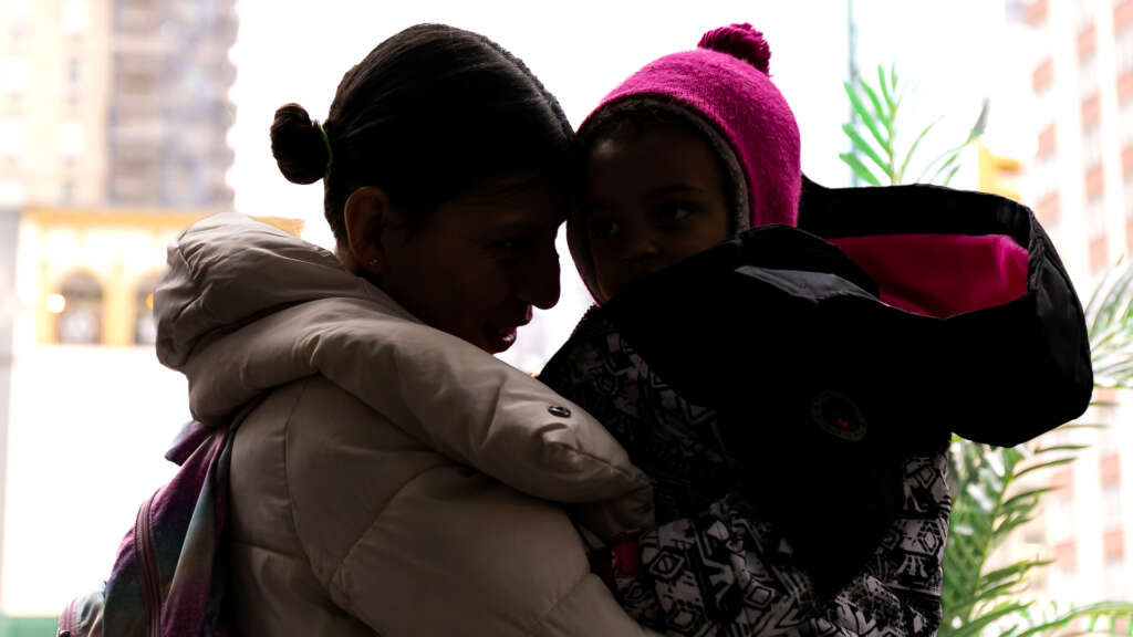 Una mujer y su hija en uno de los refugios para familias de la ciudad a principios del año pasado. En los últimos meses, la ciudad ha cerrado la mayoría de esas instalaciones, ya que el número de personas llegando ha disminuido. (Ado Talwar/City Limits)
