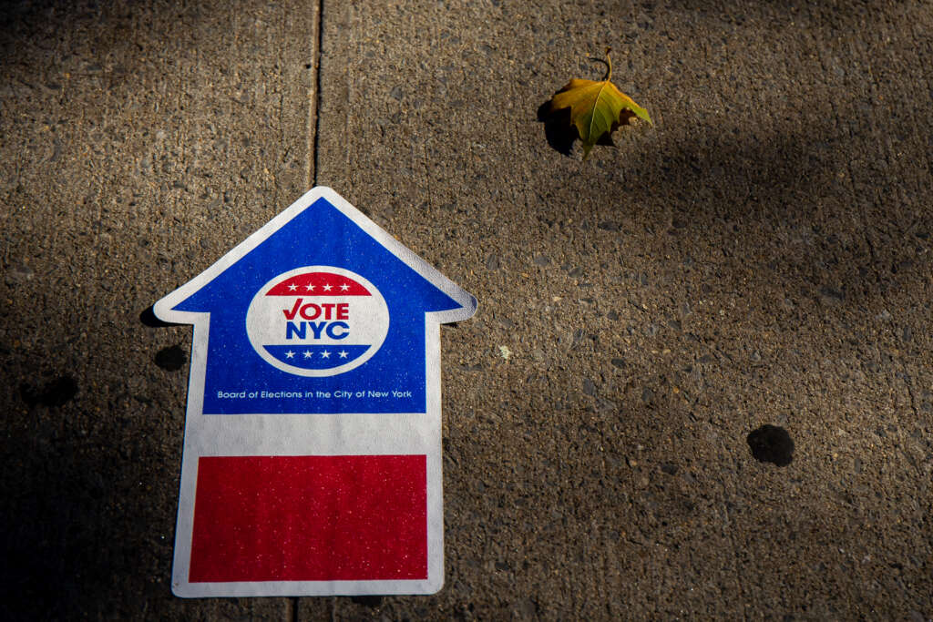 A marker directs voters to their poll site on Election Day. (Adi Talwar/City Limits)