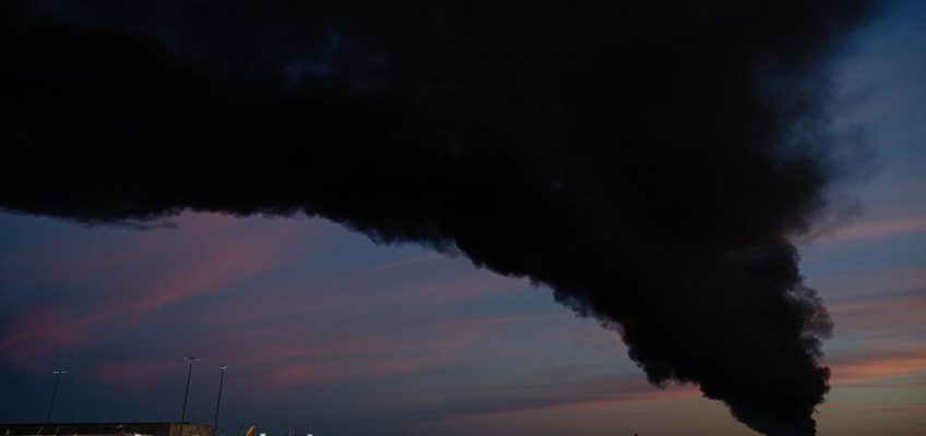 A fireball erupts near airport property after reports of a plane crash at Louisville International Airport, Tuesday, Nov. 4, 2025, in Louisville, Ky. (AP Photo/Jon Cherry)