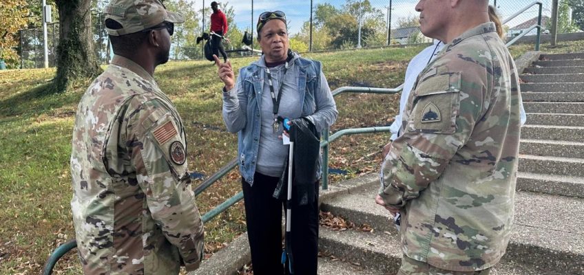 D.C. National Guard members clean up the park around Fort Stevens Recreation Center, Saturday, Oct. 11, 2025, in Washington. News of the cleanup sparked a community debate over the presence of the Guard. (AP Photo/Gary Fields)