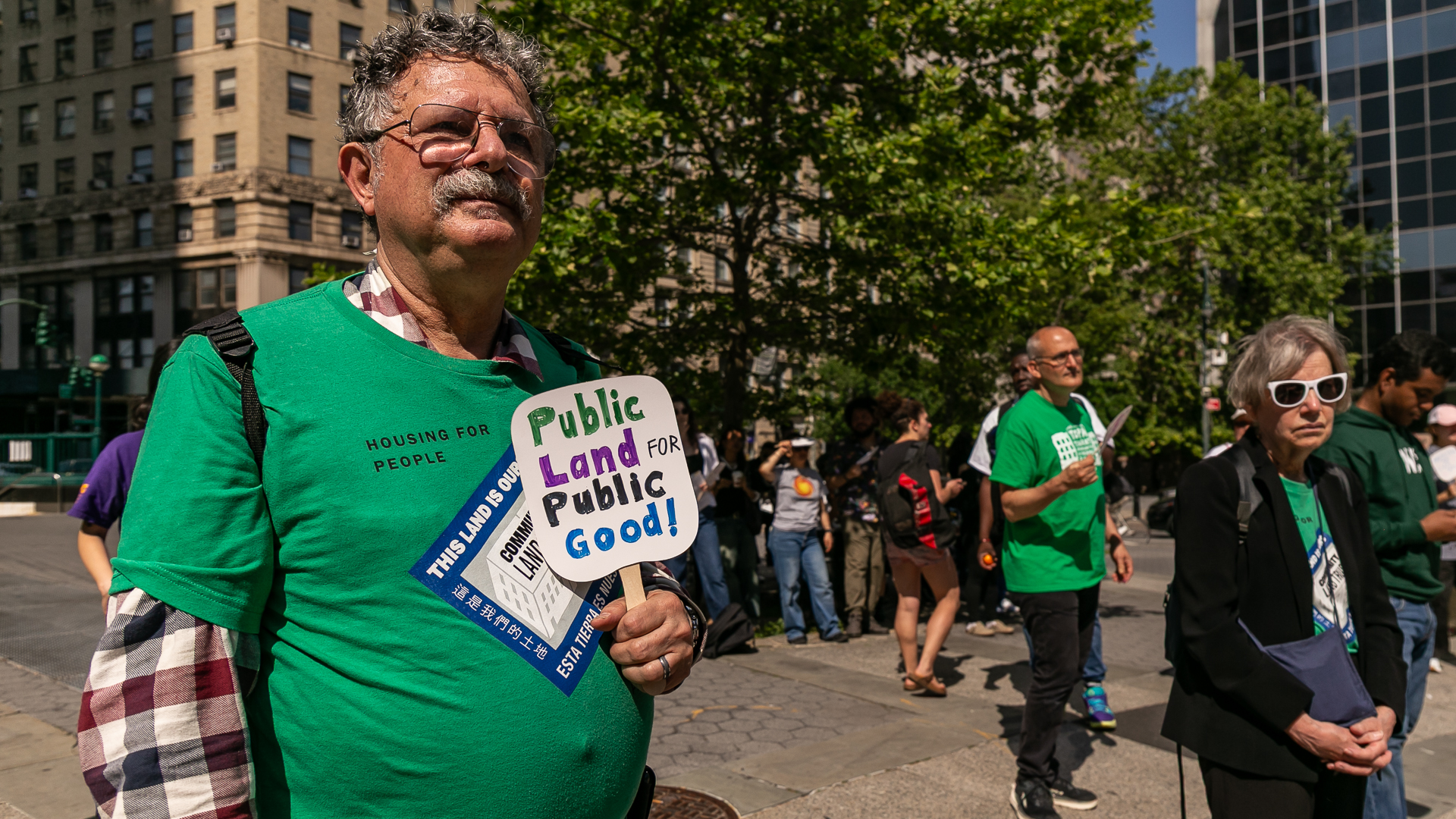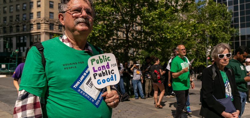 A rally in June in support of several “social housing” bills in the City Council. One of those bills, which would establish a city land bank, is on the agenda at a Council hearing Thursday. (Adi Talwar/City Limits)