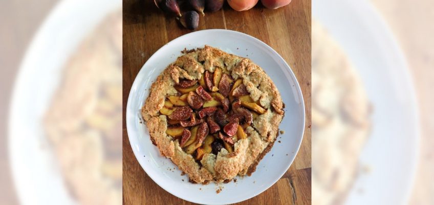 Place parchment paper with the dough on baking sheet, and arrange peach and fig slices in the center of the circle, leaving a 2-inch border. (Either pile all in the middle or make a pattern with circles.)