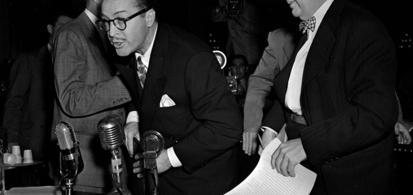 FILE – Dalton Trumbo, center, dark suit, Hollywood film writer is escorted from the witness stand by police Sgt. George Kaelber after he refused to tell the House Un-American Activities Committee, whether he is or has been a communist, Oct. 28, 1947, in Washington. The committee voted to cite him for contempt of Congress. (AP Photo/William J. Smith, File)