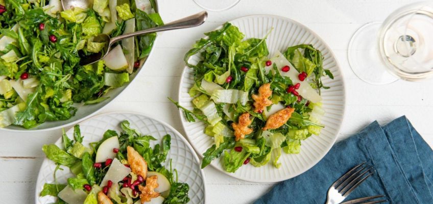 Place the arugula and romaine in a large serving bowl. Add the pears, Parmesan, and half of the pomegranate seeds to the bowl. Pour the dressing on the salad, and toss to combine. Scatter the remaining pomegranate seeds over the top, distribute the puff pastry croutons over the salad, and serve. You may also choose to serve the salads on individual plates, and then top with the remaining pomegranate seeds, and the croutons.