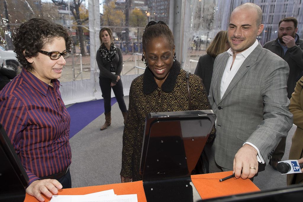Former First Lady Chirlane McCray visiting the “Talking Transition Tent” in lower Manhattan in November 2013. (Credit: Rob Bennett for the office of Mayor-elect Bill de Blasio)