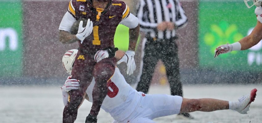 Minnesota’s biggest offensive play of the first half came on the next drive. Behind great blocks from right guard Tony Nelson, right tackle Dylan Ray and receiver Jalen Smith, Taylor busted free and had enough speed on a snowy turf to score.
