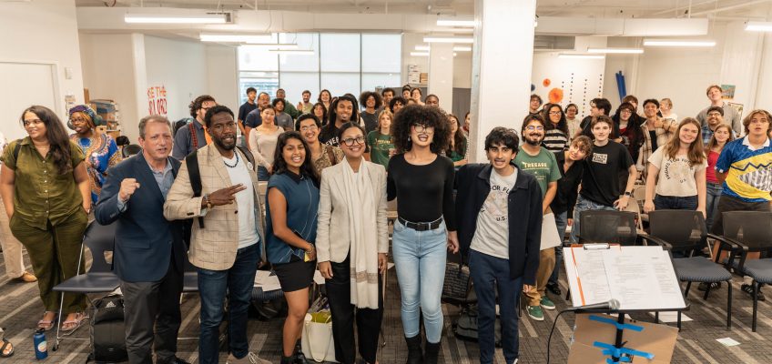 Members of several youth organizations with elected officials at the launch of their “Livable Futures” campaign earlier this fall. (Ayman Siam/Office of NYC Comptroller)