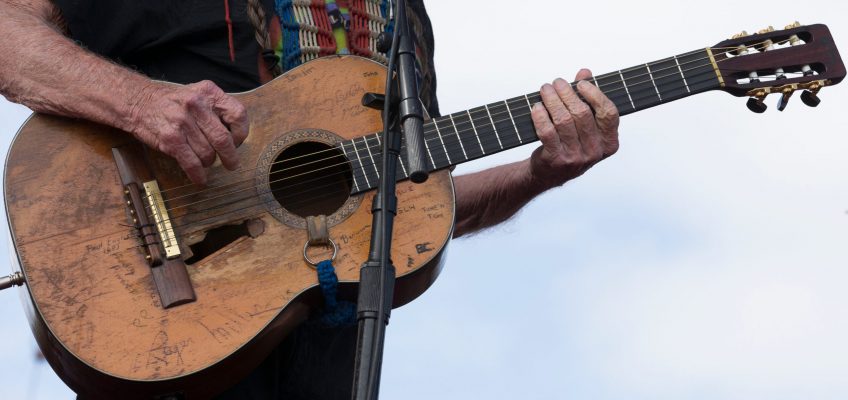 Trigger had accompanied Willie’s soft twang on “Stardust,” the now triple-platinum 1978 album that brought the mainstream to country. Can you look at the endless sky in these hills and not hear Willie’s voice singing Irving Berlin’s “Blue Skies”? Willie wrestled that immortal song into our mortal world, his fingers caressing Trigger, the very instrument that birthed so many iconic tunes: “Angel Flying Too Close to the Ground” (1980) ; “Always On My Mind” (1982) ; “On the Road Again” (1988).