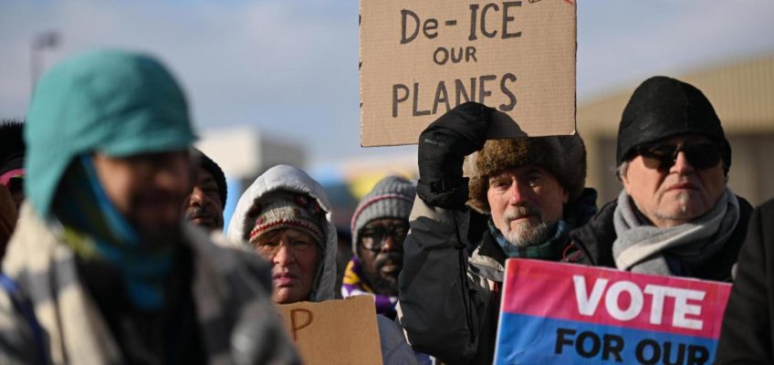 Protesters gather at a rally for immigrants and workers outside Signature Aviation near the Minneapolis–Saint Paul International Airport, Wednesday, Dec 3, 2025, in Minneapolis. (AP Photo/Tom Baker)