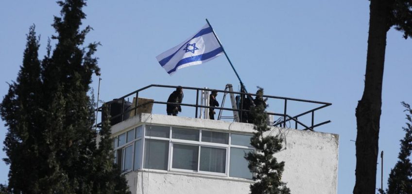 Photos taken by an Associated Press photographer show police erecting an Israeli flag on the compound, and police cars on the street. Photos provided by UNRWA staff show a group of Israeli police officers in the compound.