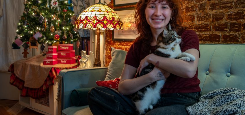 NEW YORK – Caroline Schettler, 28, in her apartment in East Harlem, where she said previous ownership was known for “slapping a Band-Aid over something that needs stitches—or needs surgery,” when it came to repairs. (Adi Talwar/City Limits)