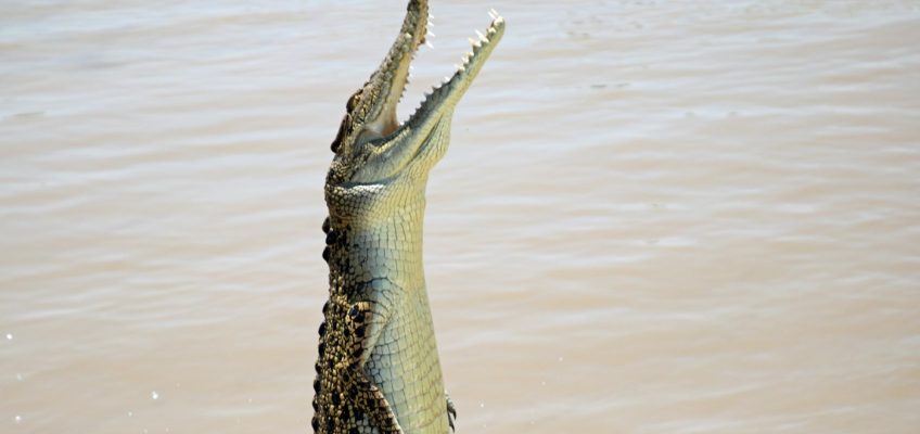 Darwin is the tropical capital city and most populated of Oz’s Northern Territory, a vast, mostly uninhabited “outback” region and the must-visit “crocodile capital of the world.” The territory — twice the size of Texas — is home to an estimated 100,000 wild “salties” (that’s what Aussies call them) and 260,000 people, which is roughly one salty for every couple with a baby. I’m from croc-less California, so there’s no such dangerous beasts lying on beaches, infesting rivers, creeks and harbors, eating you when you swim, and making cameos in public pools, women’s water aerobic classes and backyards. Very weirdly, it’s legal to keep a crocodile as a pet in Darwin if you have a permit and obey strict rules about its enclosure.