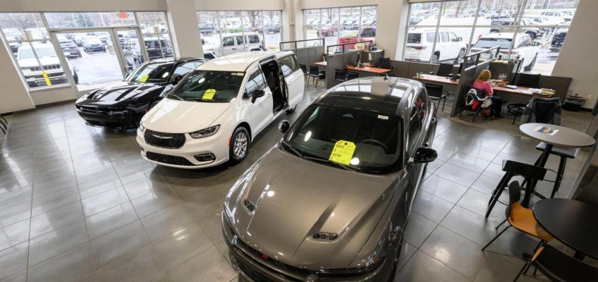 Sy Newman of Walled Lake checks out the vehicles in the showroom while waiting for his car to be serviced at the Golling Chrysler Dodge Jeep Ram dealership in Bloomfield Hills, April 10, 2025. (David Guralnick, Detroit News/The Detroit News/TNS)