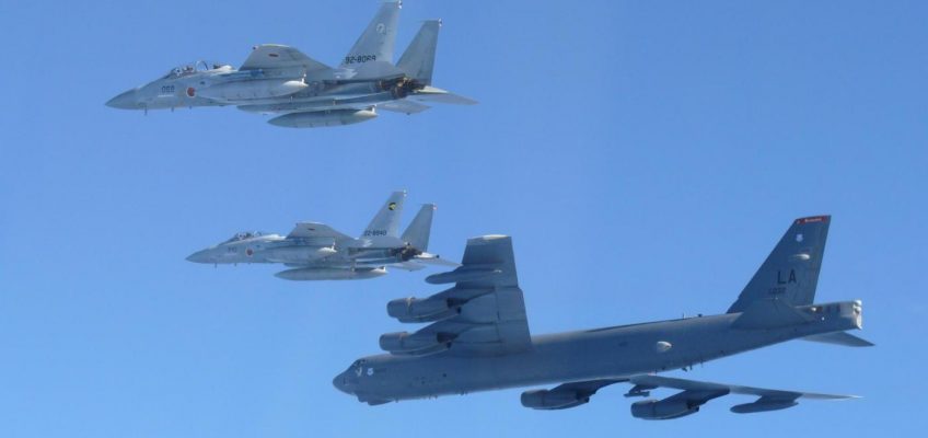 Two U.S. B-52 strategic bombers and three Japanese F-35 stealth fighter jets and three F-15 jets conducted their joint flight drills near Japan’s western airspace, above the waters between the country and South Korea, officials said.