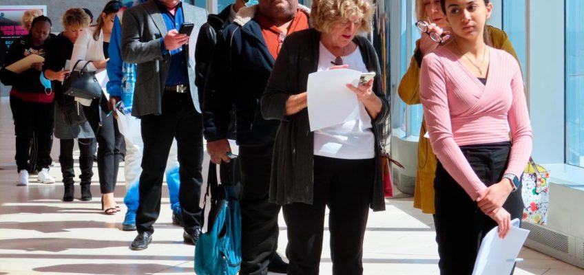 WASHINGTON (AP) — The number of Americans applying for unemployment benefits jumped last week, but the total number of those collecting benefits fell to the lowest level in eight months.