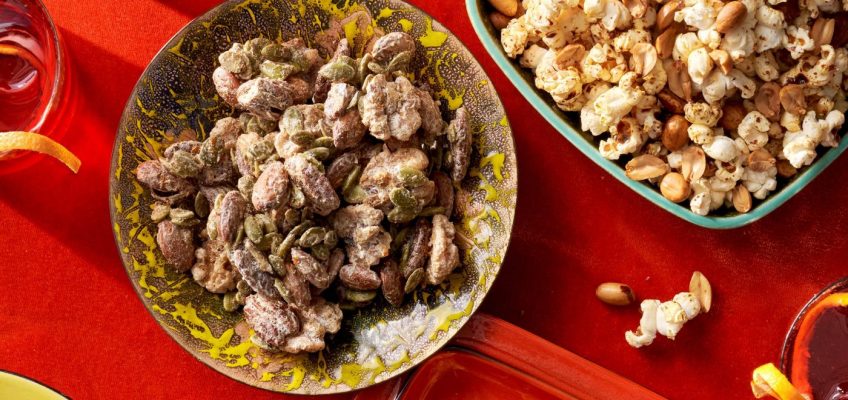 This second leans more savory, featuring nuts enlivened with citrus, sage, fennel and cumin, and delicately held together with whipped egg whites, for a headier, more sophisticated snack bowl you might see on the bar. Large nuts such as pecans, walnuts and cashews work best, and seeds such as pumpkin, sesame or even flaxseeds can fill the spaces in between. When gently baked in a low temperature oven, this mix will release a fragrant parade, marching through to fill your kitchen and home with its scent.