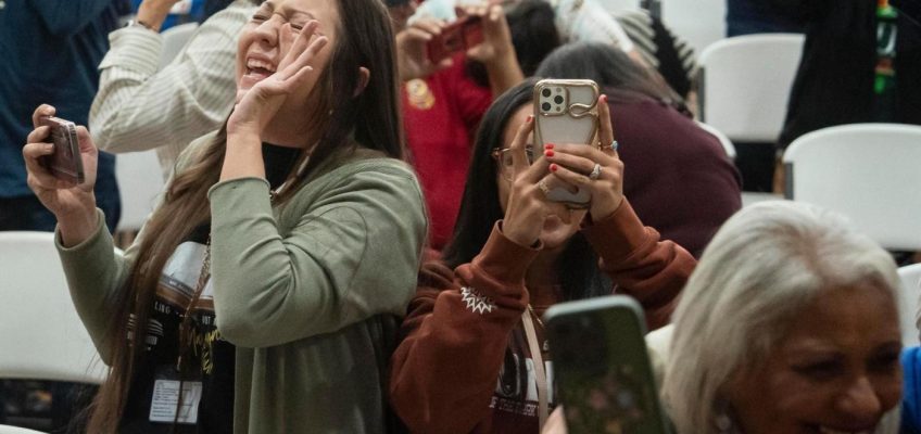 Over 200 Lumbee members gathered in a gymnasium in Pembroke, North Carolina, to watch the final Senate vote on television. They celebrated with shouts, raised hands and applause as the unofficial tally indicated the bill would receive final congressional approval.