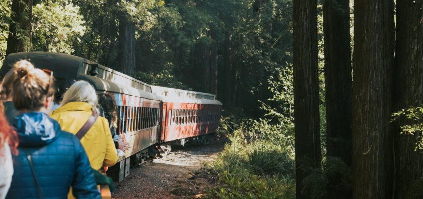 Guests enjoy the open-air car’s perfect view as the train snakes its way through the lush Mendocino redwoods.