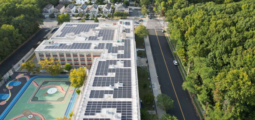 Solar panels at I.S. 007 Elias Bernstein, one of over 100 city schools with new solar arrays. (Photo via DCAS)
