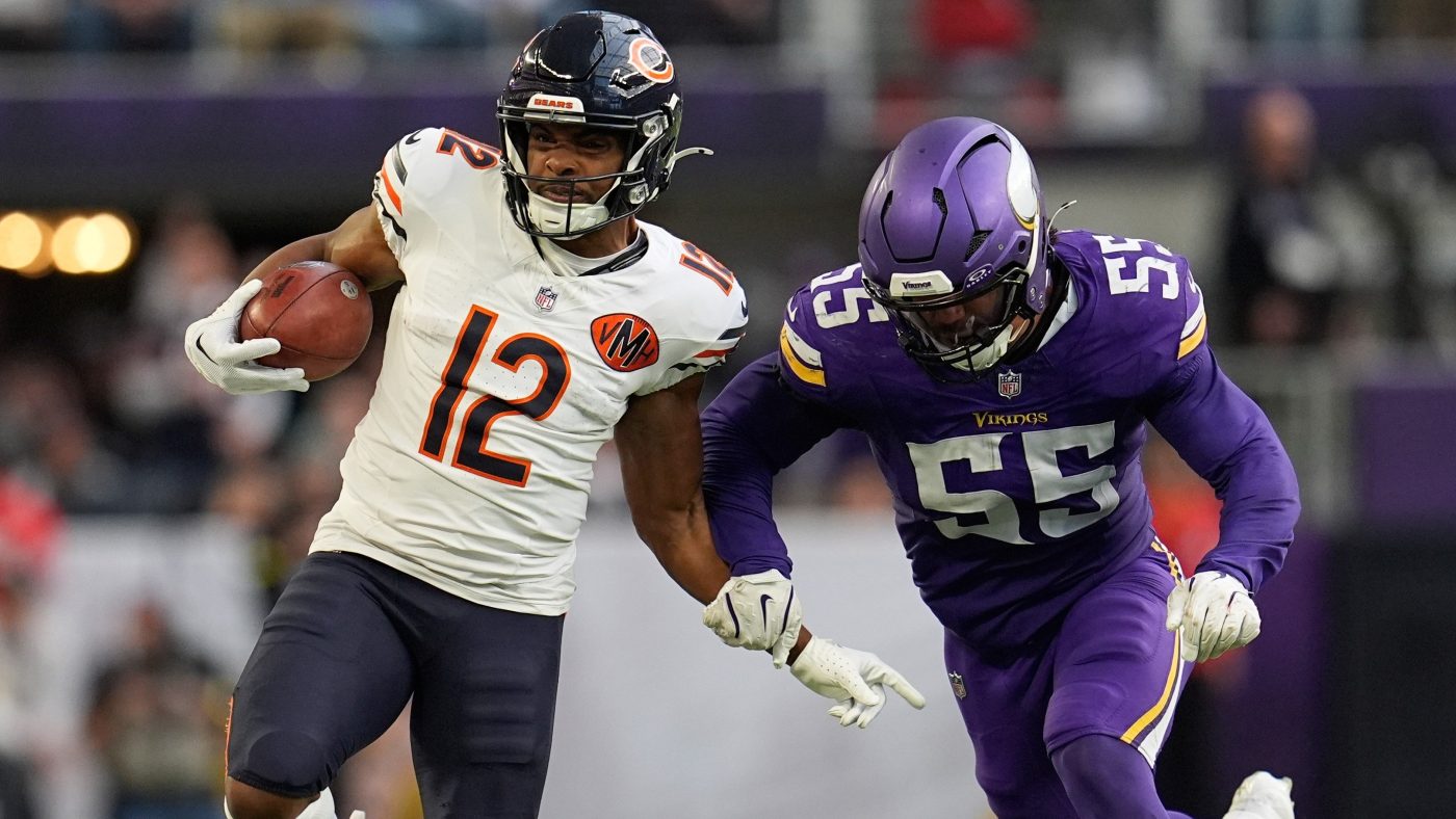 Chicago Bears wide receiver Devin Duvernay (12) leaves the field after an NFL football game against the Minnesota Vikings, Sunday, Nov. 16, 2025, in Minneapolis. (AP Photo/Abbie Parr)