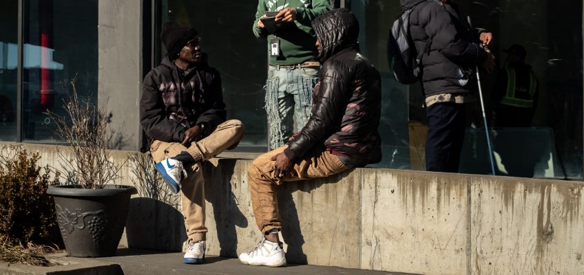 Hombres frente a un refugio para migrantes adultos en el Bronx la primavera pasada. (Adi Talwar/City Limits)