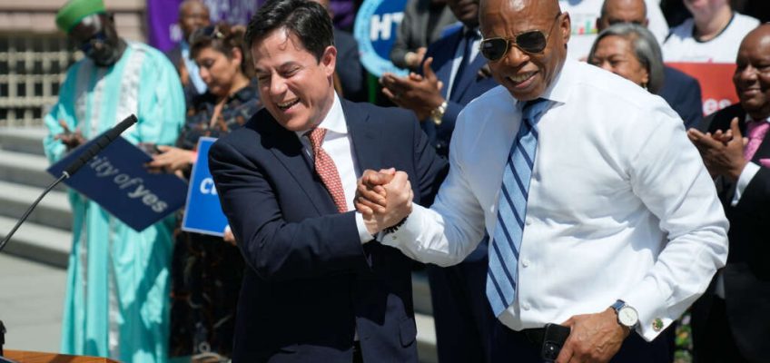 Dan Garodnick, left, with former Mayor Eric Adams at a rally for the “City of Yes” plan in 2024. (Michael Appleton/Mayoral Photography Office)
