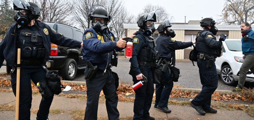 St. Paul police sprayed chemical irritants. After someone threw an object at a departing police vehicle’s back window and broke it, police launched 40-mm projectiles and chemical munitions.