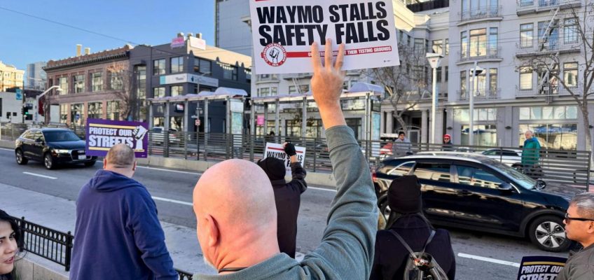 A steady stream of Waymo cars drove past the protest, a testament to the growing ubiquity of the white cars in San Francisco.