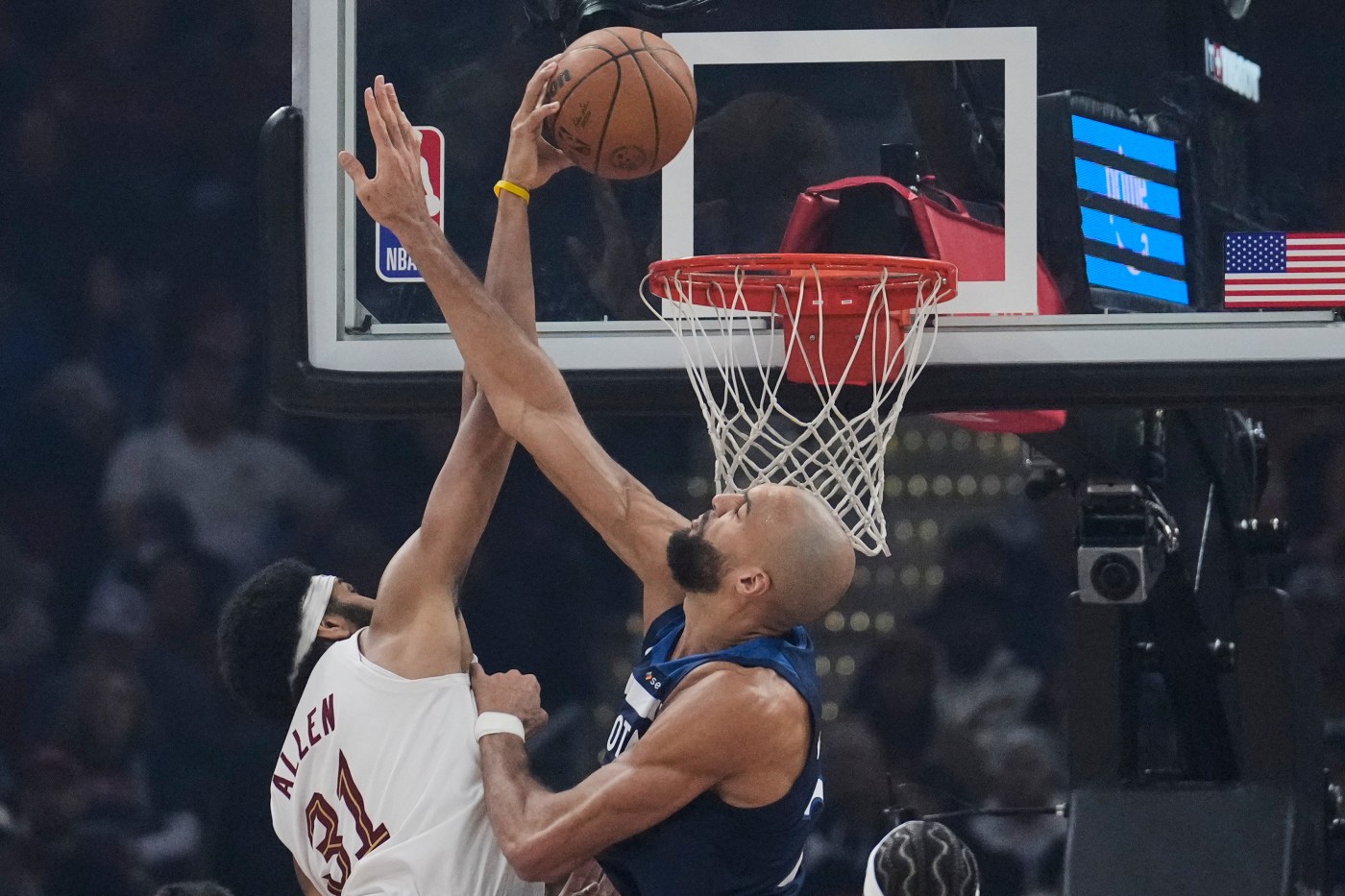 Minnesota Timberwolves center Rudy Gobert, left, fouls Cleveland Cavaliers center Jarrett Allen, right, in the first half of an NBA basketball game Sunday, Jan. 4, 2026, in Cleveland. (AP Photo/Sue Ogrocki)