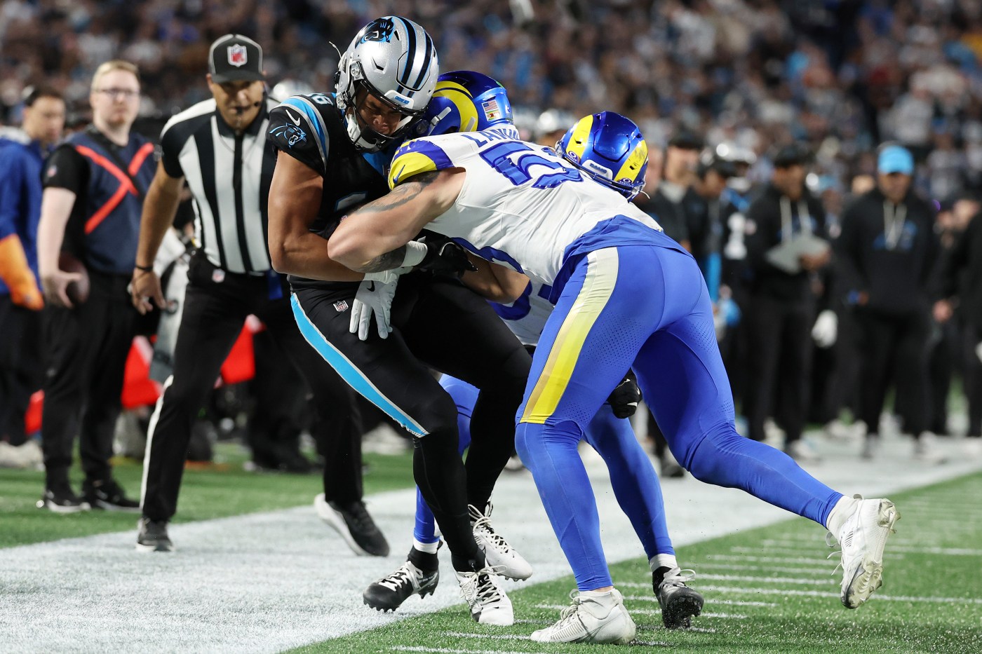 CHARLOTTE, NORTH CAROLINA – JANUARY 10: Colby Parkinson #84 of the Los Angeles Rams catches a 19 yard touchdown pass against Tre’von Moehrig #7 of the Carolina Panthers during the fourth quarter in the NFC Wild Card Playoff game at Bank of America Stadium on January 10, 2026 in Charlotte, North Carolina. (Photo by Jared C. Tilton/Getty Images)