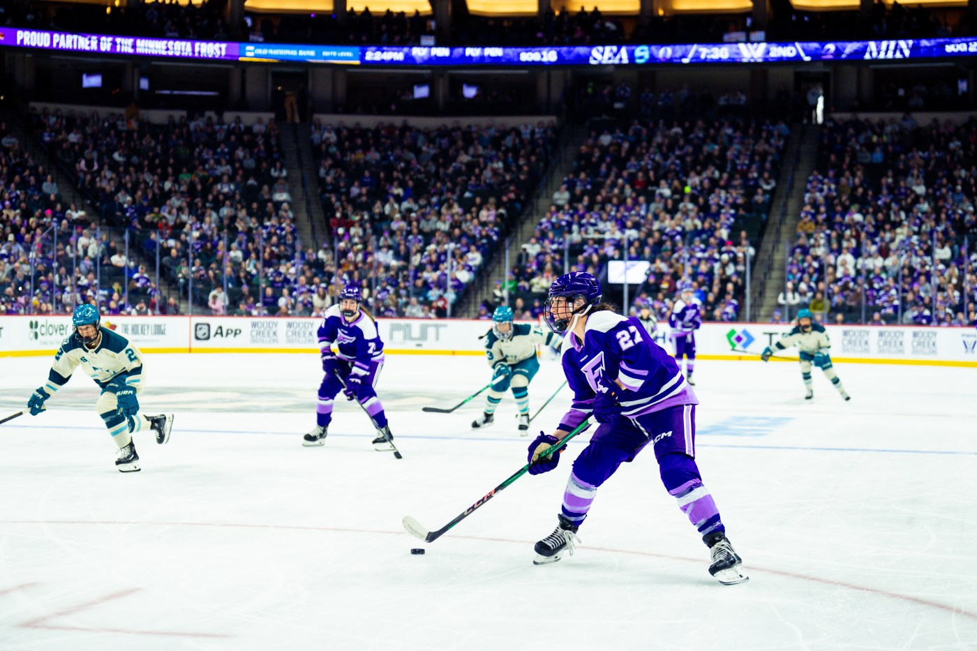 Minnesota’s Mae Batherson controls the puck behind the night during the Frost’s game against Seattle at the Grand Casino Arena on January 11, 2026 in St. Paul, Minnesota. (Courtesy of PWHL)