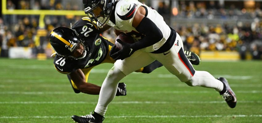 PITTSBURGH, PENNSYLVANIA – JANUARY 12: Payton Wilson #41 of the Pittsburgh Steelers and James Pierre #42 of the Pittsburgh Steelers tackle Christian Kirk #13 of the Houston Texans in the second quarter of an NFL wild card playoff game at Acrisure Stadium on January 12, 2026 in Pittsburgh, Pennsylvania. (Photo by Justin K. Aller/Getty Images)