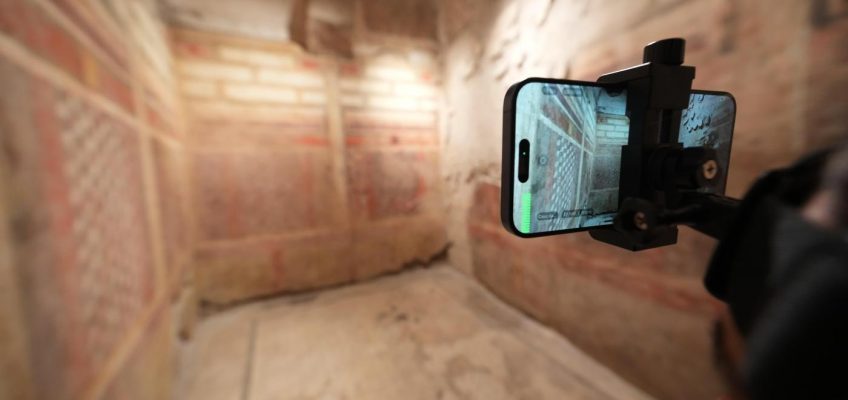 Visitors won’t actually walk through the home’s intimate rooms, which are only accessible via a perilously steep staircase underground. Rather, visitors above ground will watch as a tour guide wearing a head-mounted smartphone descends into the domus and walks through its rooms, livestreaming the visit and narration.
