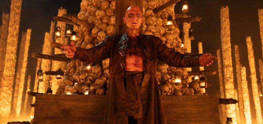 In “The Bone Temple,” it’s not the zombies one has to worry about — it’s the Jimmies. Our young hero Spike (Alfie Williams), having abandoned the secluded safety of his island home in the wake of his mother’s death, finds himself at the mercy of this merry band of bloodthirsty pranksters, shepherded by a sadistic Manson-esque leader, Sir Lord Jimmy Crystal (Jack O’Connell).