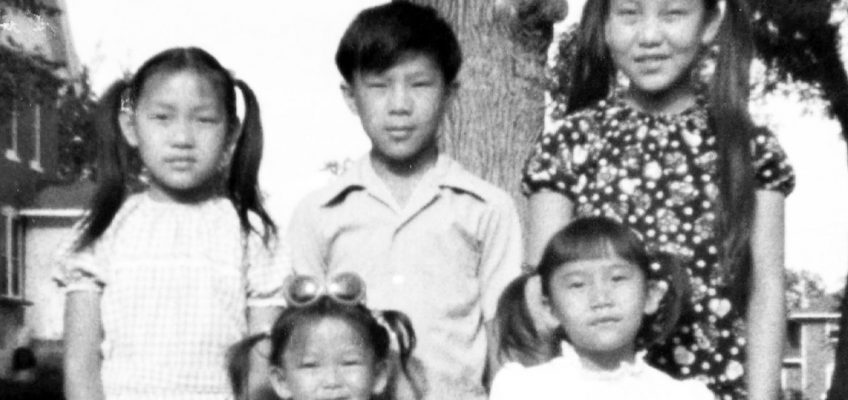 An undated black and white courtesy photo of the Thao siblings in Sparta, Wis., their first home in America. Back row, from left: May la, Yia, Gao Sheng. Front from left: Round Moon and Good Xai. (Courtesy of the Thao Family)